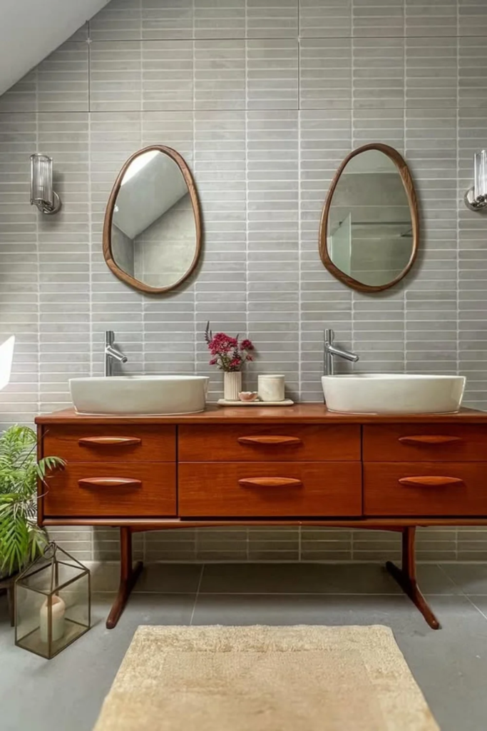 Mid-century inspired mirrors bring warmth through shape and tone. These mirrors often use rounded edges and simple frames that feel natural. They work well with wood vanities and warm wall colors.