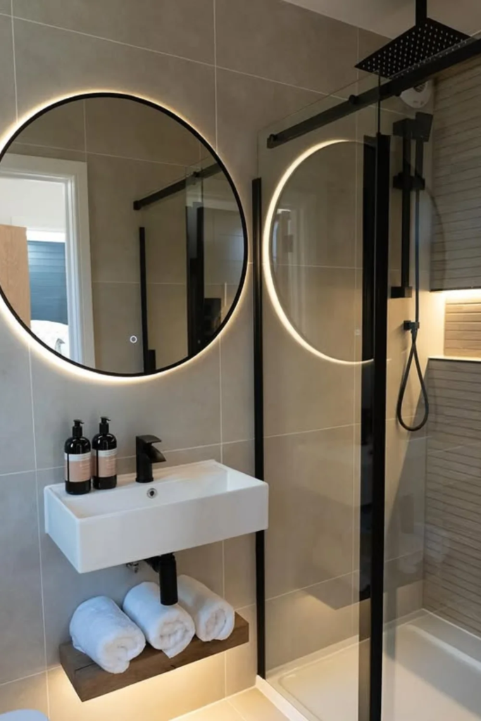 A mirror with a thin black edge adds contrast without feeling heavy. When paired with soft lighting, it creates a balanced look that works in modern bathrooms. The black edge defines the mirror while the glow keeps the space light.