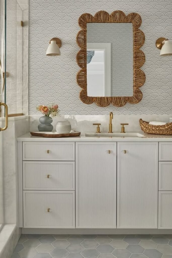Mirrors with woven or textured frames add warmth and depth. These mirrors bring a natural feel into the bathroom and soften hard surfaces.
