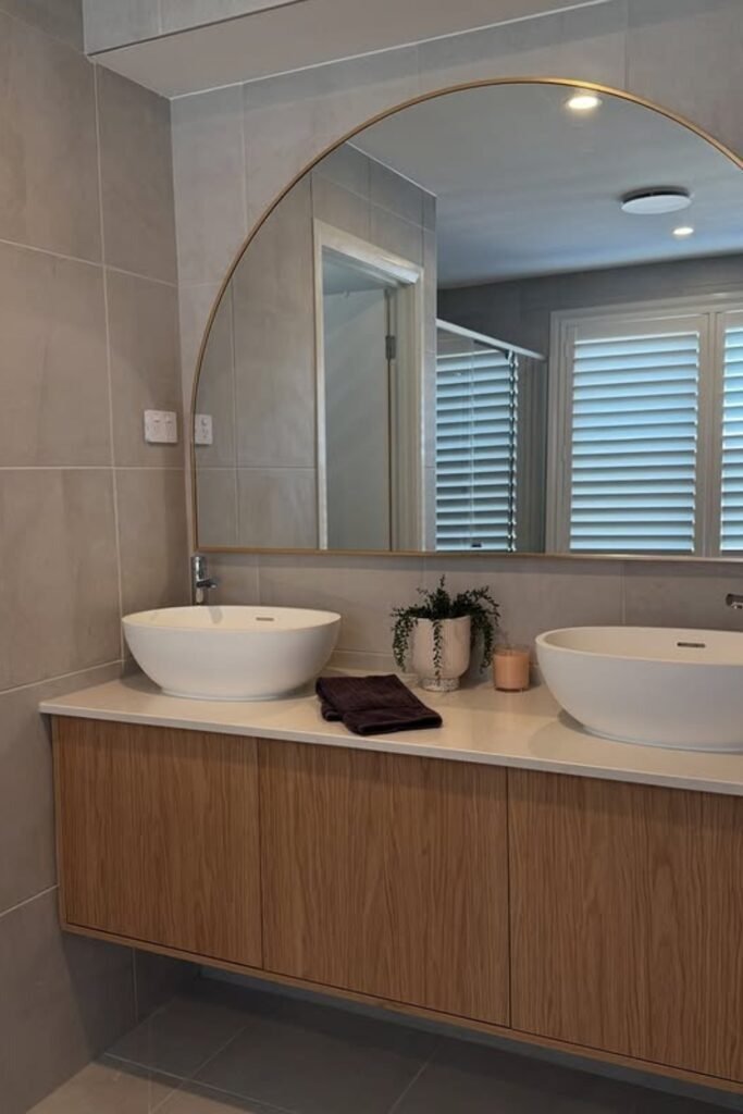Mirrors with soft curves bring balance to bathrooms filled with straight lines. A gently curved mirror softens the look of square sinks, tile grids, and sharp corners. This style feels friendly and welcoming without standing out too much.