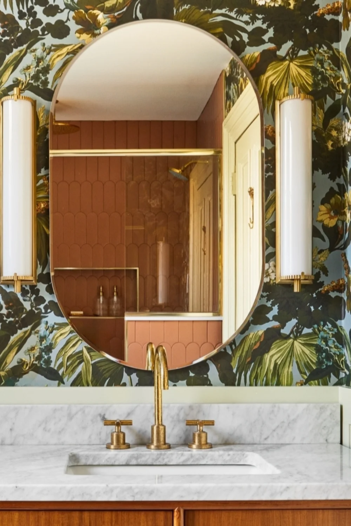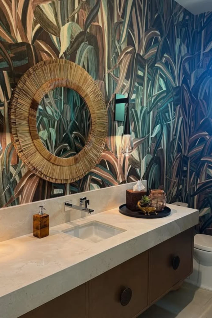 Tropical wallpaper with palm leaves or oversized greenery brings energy to a bathroom vanity area. When paired with warm metals like brass or gold, it creates a glam look that still feels relaxed. This idea works well behind a mirror wall where the pattern can reflect light and open up the space.