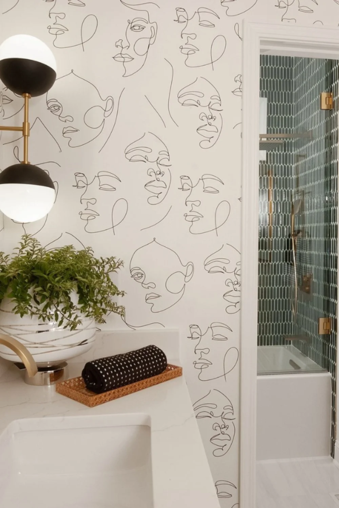 Line art wallpaper uses simple shapes and thin lines to add interest without clutter. This is a strong choice for modern bathrooms. It keeps the space looking clean while avoiding blank walls.
