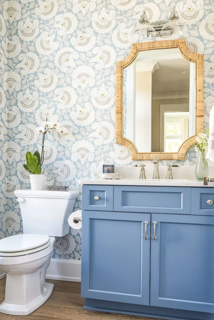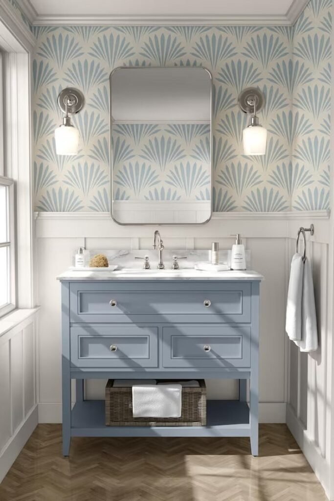 Coastal wallpaper in shades of blue brings a clean and airy feel. Patterns inspired by waves, shells, or soft stripes work best. This idea fits both modern and traditional bathrooms.