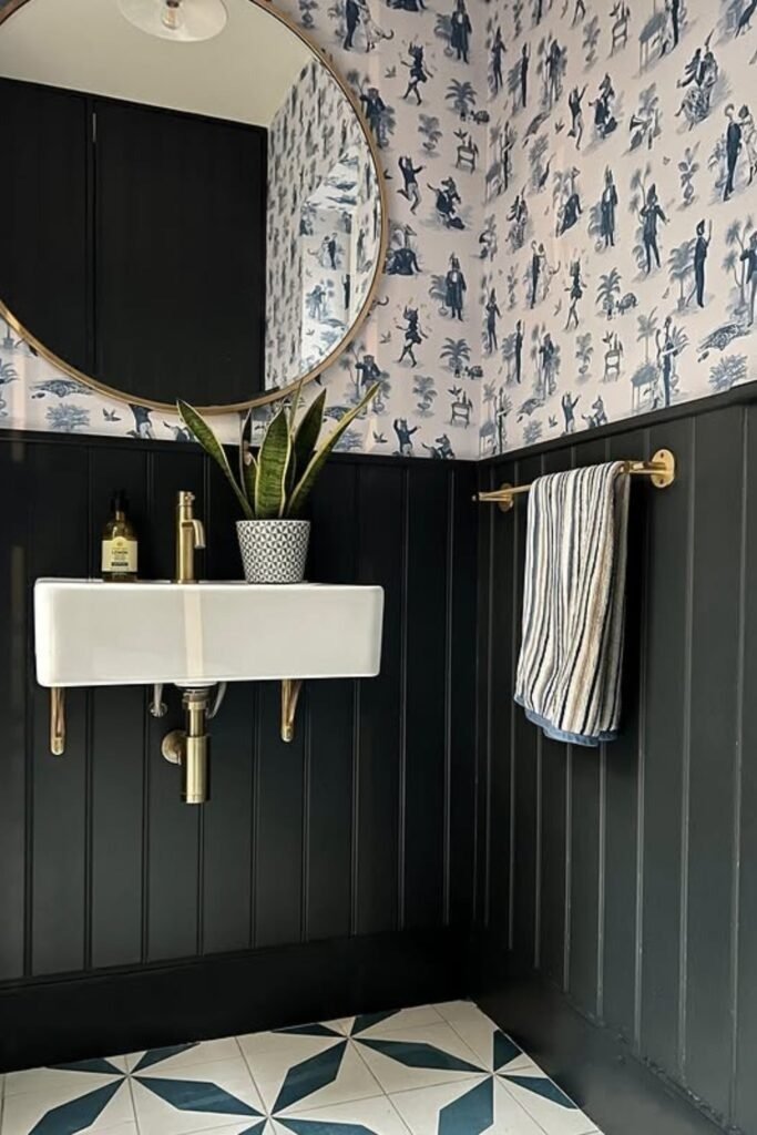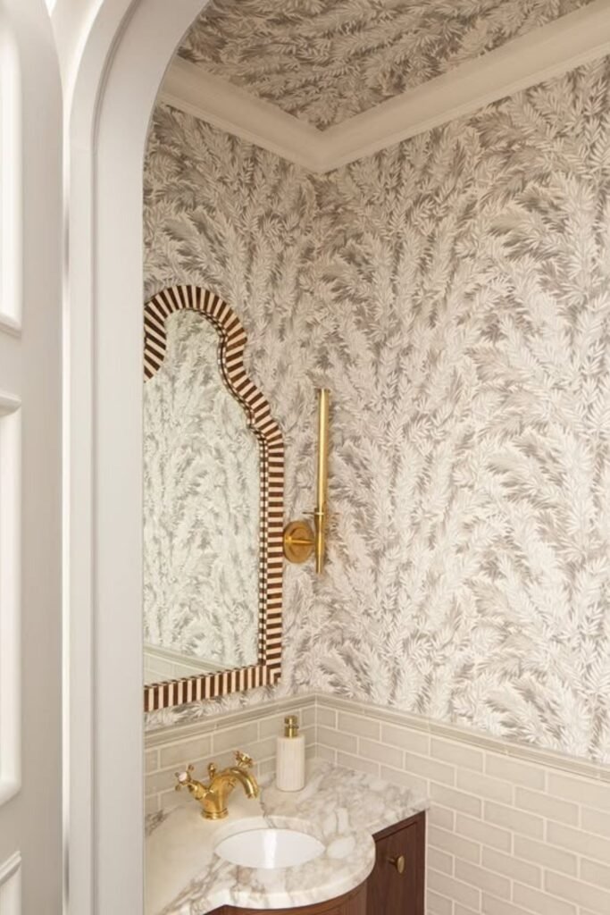 This style works well because powder rooms usually have less moisture than full baths. That makes them perfect for richer patterns and deeper colors. The result feels bold but still practical.