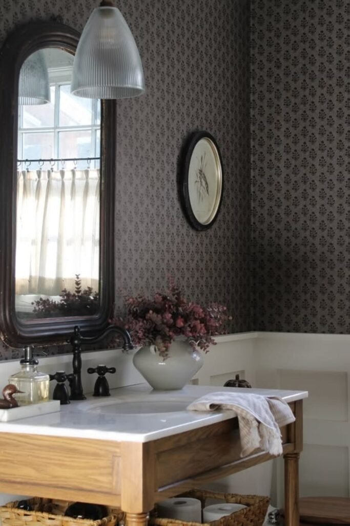 A moody floral wallpaper turns a small powder room into a space people remember. Dark backgrounds with large floral prints add depth and make the room feel styled instead of plain. In smaller bathrooms, this look works best when paired with simple fixtures and soft lighting. The wallpaper does the work without making the space feel busy.