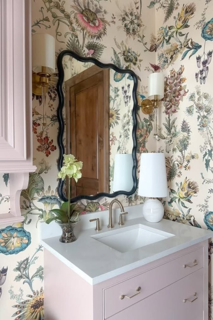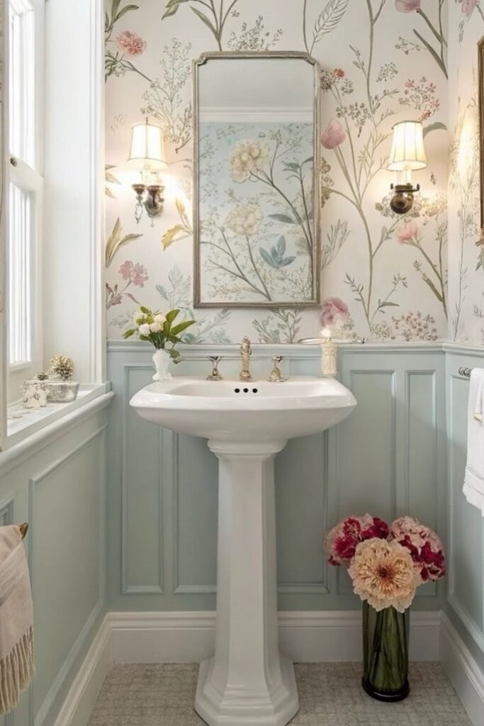 Cottage-style floral wallpaper creates a cozy and relaxed mood. Soft colors and gentle patterns work best here. This idea fits well in older homes or bathrooms with classic fixtures.