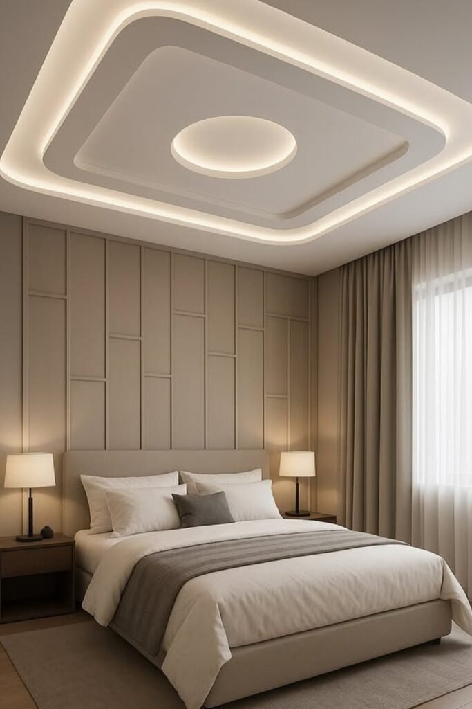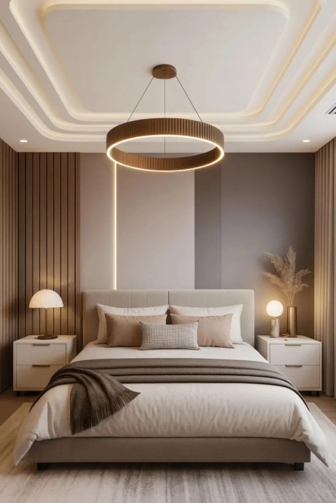 A layered LED ceiling adds modern flair with hidden lighting strips. The layers are usually geometric and can frame the room subtly. LED lights make it possible to adjust brightness and even color, giving you flexibility for sleep, relaxation, or reading. This design is ideal for bedrooms that need a clean, modern look without large fixtures hanging down. Layered LEDs provide both function and ambiance.