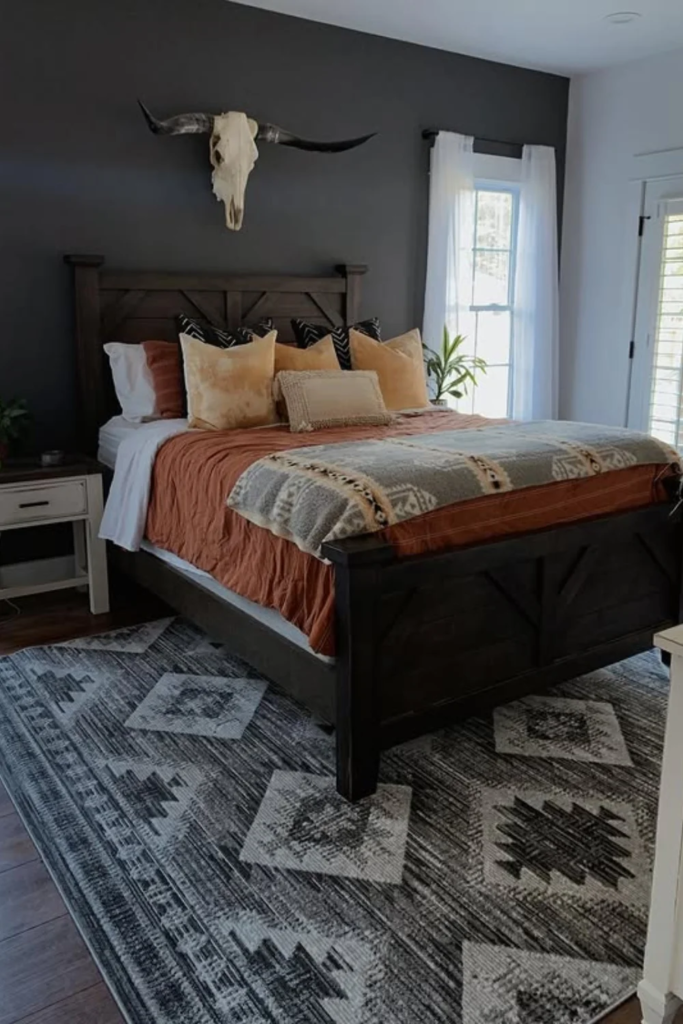 In bedrooms with dark walls or deep wood furniture, a lighter rug can soften the overall feel. Dark rooms can feel heavy without balance. A rug in a soft cream or warm gray lifts the space and adds contrast in a gentle way. This keeps the room from feeling closed in while still allowing darker tones to feel rich and calm.