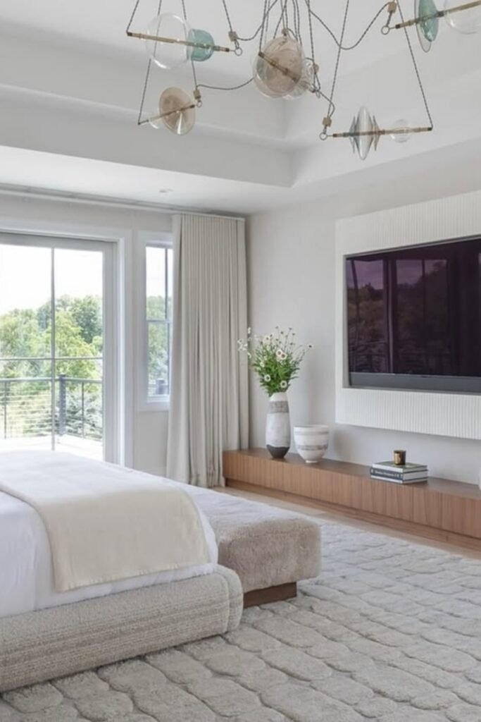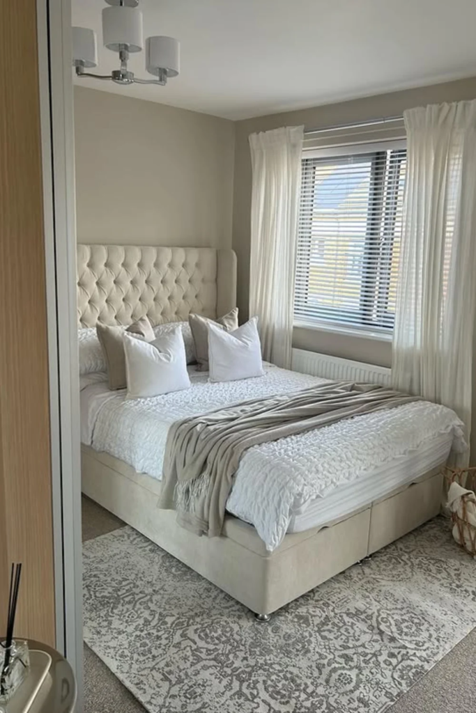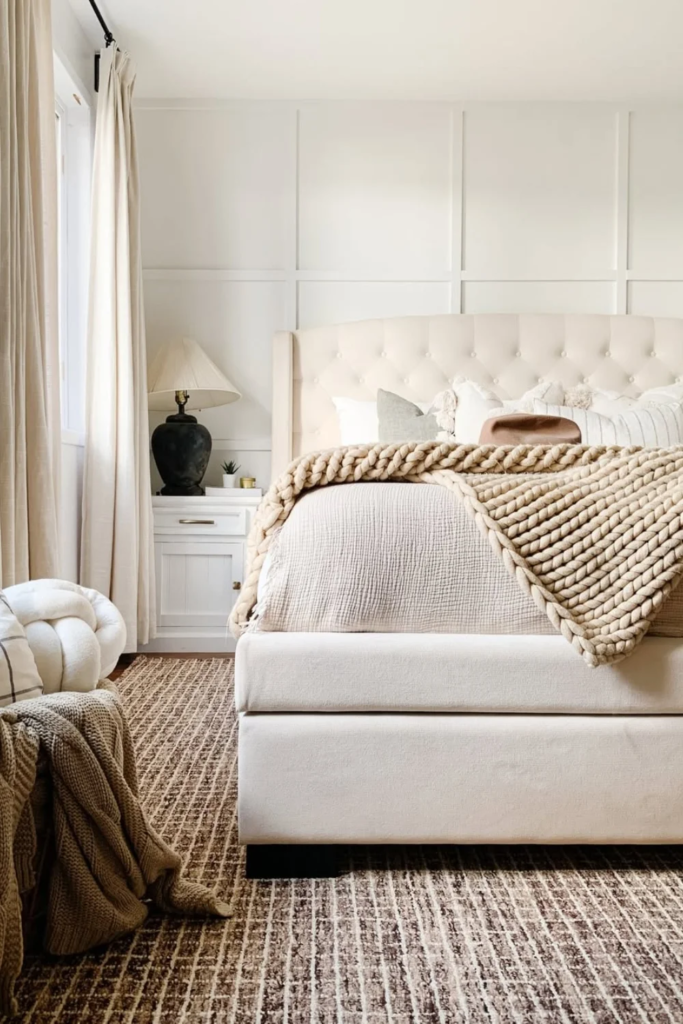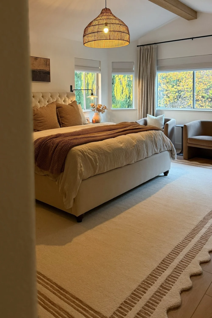 In bedrooms filled with soft materials like upholstered beds and thick curtains, a rug can still define the space without adding sharpness. A soft rug with a clear edge or border gives shape while keeping comfort. This balance helps the room feel intentional rather than overly plush.