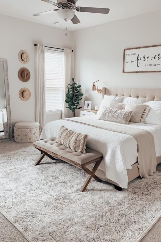 A patterned rug can balance simple furniture and plain walls. The key is keeping the pattern gentle and the colors limited. This creates interest without noise. It works well in bedrooms that feel unfinished or too bare.