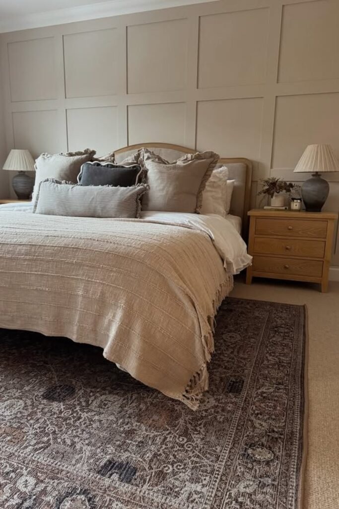 Sometimes a bedroom needs just a little contrast to feel finished. A rug with a slightly darker border or gentle shift in tone can provide that grounding effect. This helps define the bed area without adding clutter. It also guides the eye through the room in a calm way.