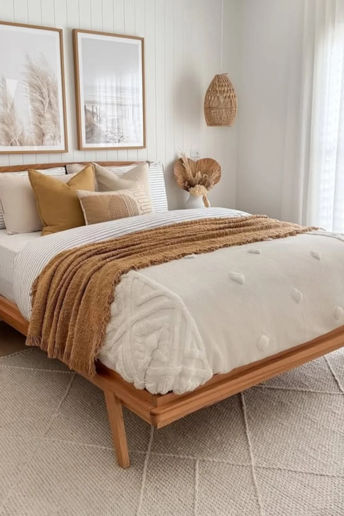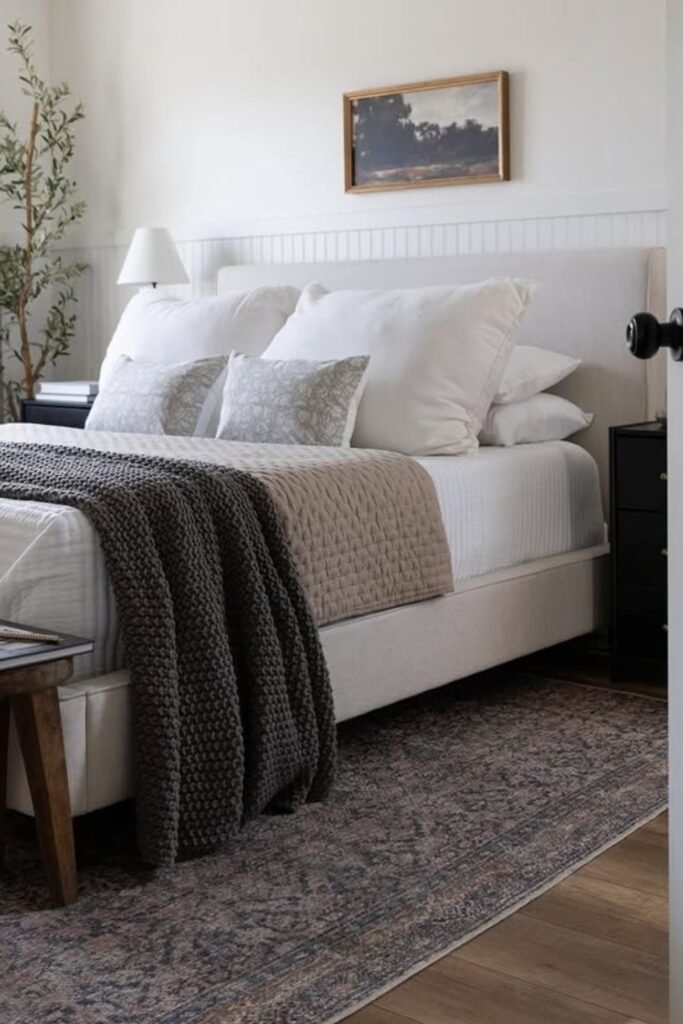 A rug that is slightly darker than the floor can help ground the bed. This contrast defines the sleeping area and adds depth to the room. The key is keeping the contrast gentle. Soft charcoal, warm taupe, or muted brown tones work better than strong black. This idea is useful in bedrooms with light floors that need visual weight.