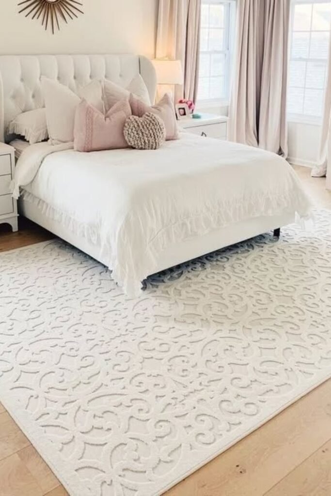 Subtle patterns help anchor the bed without distraction. These rugs often use tone-on-tone designs that are visible up close but quiet from a distance. This approach adds depth and keeps the room feeling layered and thoughtful.
