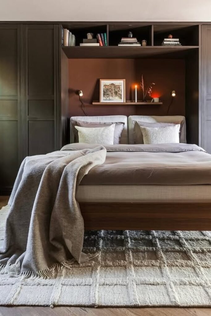Bedrooms with dark built-in furniture can feel heavy without balance. A soft rug lightens the floor and creates breathing room. This contrast keeps the room from feeling boxed in. It also helps highlight the furniture by giving it a softer base.