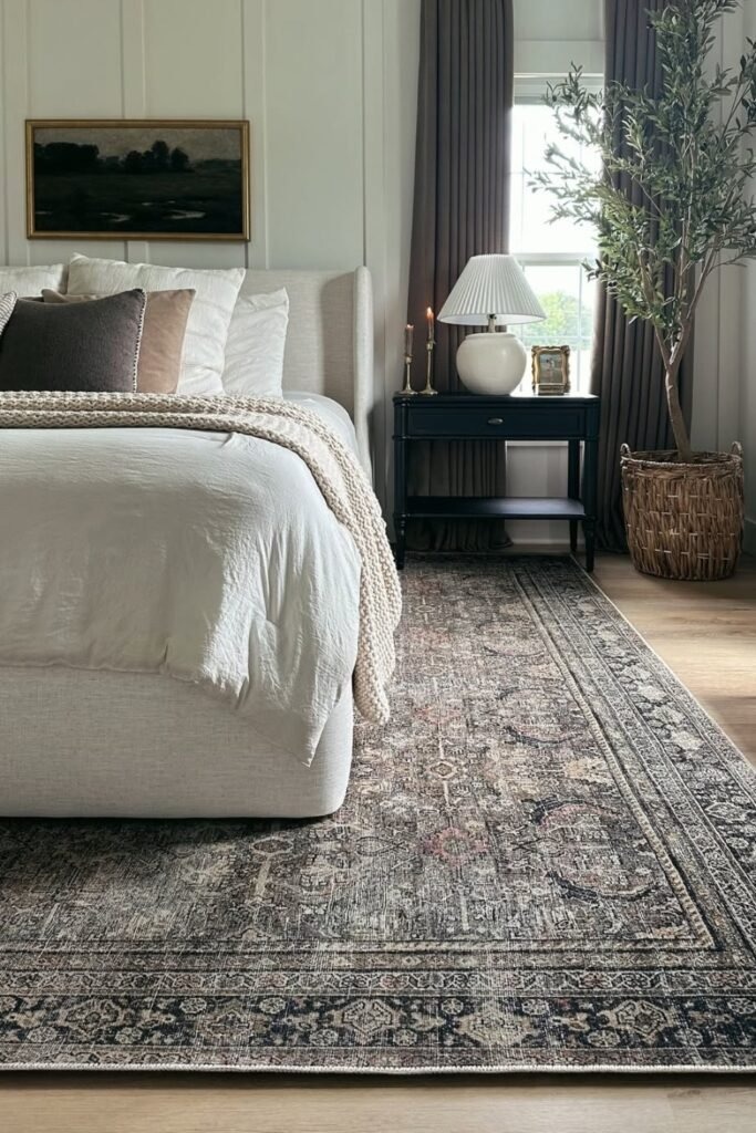 Classic rug designs with softened colors bring depth without trend risk. These rugs often feel familiar and comforting. They work well in bedrooms meant to last through many years and changes. The rug becomes a steady part of the room rather than a statement piece.