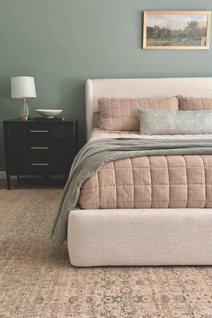 Muted colors are becoming more popular than strong shades because they feel calm and lived in. Think soft sage, dusty blue, or gentle clay tones. A rug in one of these colors can connect the bed, walls, and decor without standing out too much. This works especially well in bedrooms where color already exists but needs balance. The rug becomes the piece that holds everything together and makes the space feel thoughtful rather than busy.