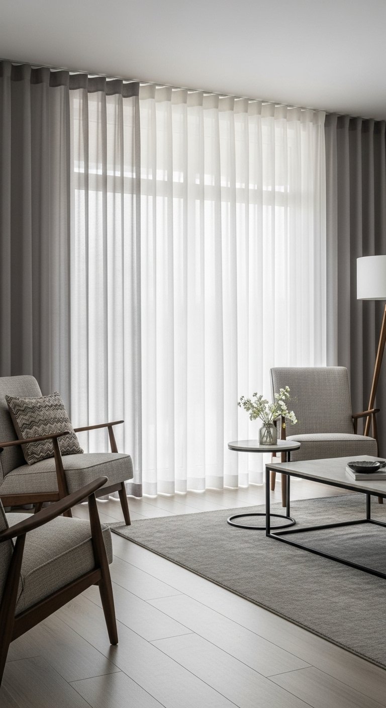 Sheer curtains stay closed most of the time to soften light, while drapes can be pulled at night or during strong sun. This system works well for street-facing living rooms or homes with large glass walls. From experience, this setup gives homeowners comfort without making the room feel dark or heavy.