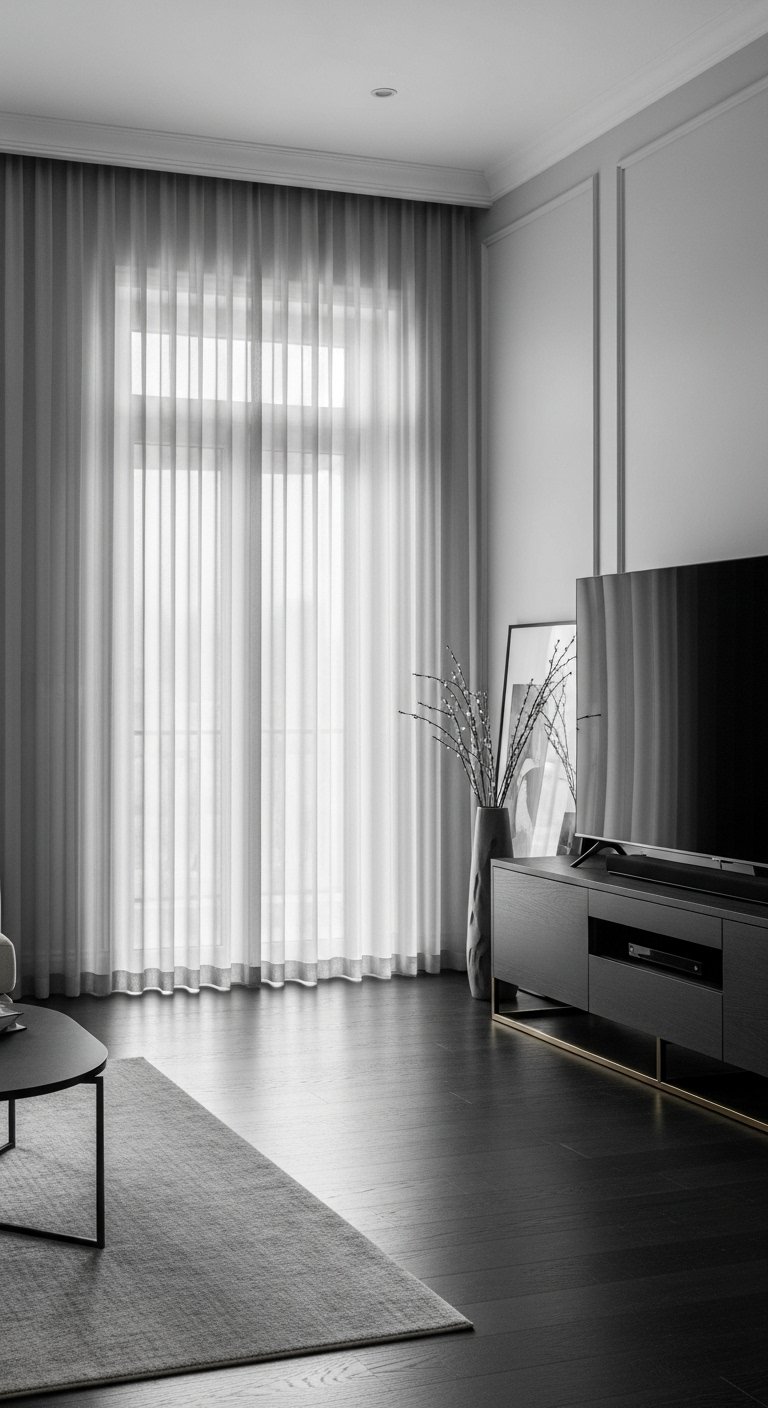 Soft gray sheer curtains are a smart option when white feels too bright or plain. Gray tones reduce glare while keeping the room open and bright. They work well in living rooms with large TVs, dark floors, or black window frames.