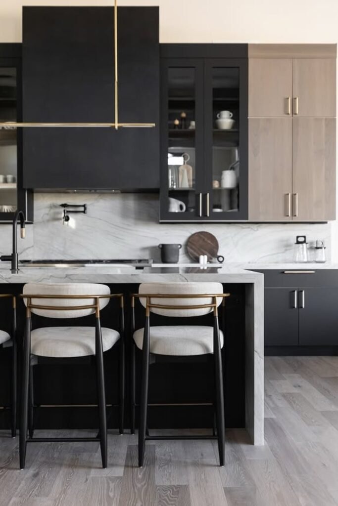 Using more than one wood tone with black cabinets adds depth. The key is keeping wood finishes natural and not too dark. This keeps the kitchen from feeling heavy.