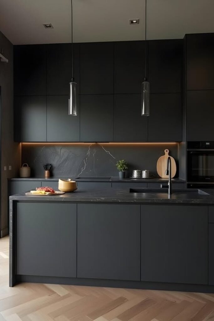 A black-on-black kitchen with varied finishes feels modern but not cold. Using different textures, such as matte cabinets and soft stone counters, keeps the space from blending into one tone. Lighting is essential here to define edges.