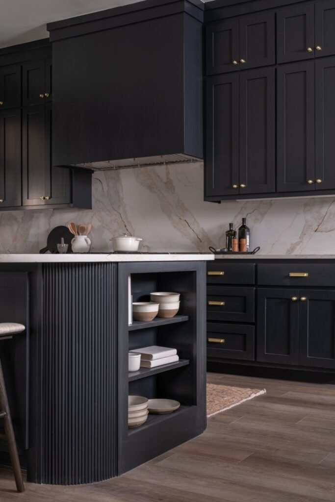 Brass fixtures with a soft finish bring character to black cabinets. Over time, brass develops a patina that adds charm. This pairing works well in kitchens that aim for a collected, not new, look.