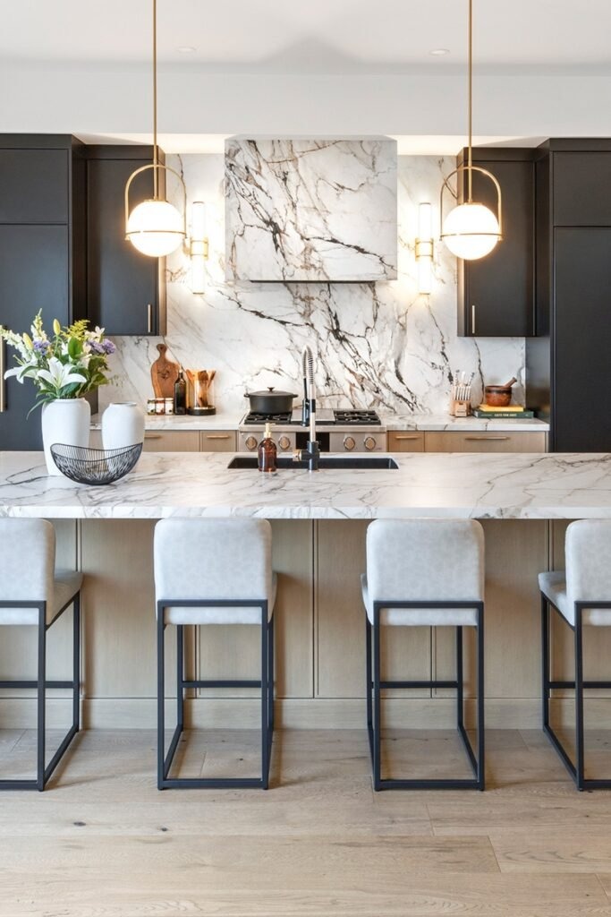 When the marble has bold veining, it lifts black cabinets even more. The movement in the stone becomes the focus, while the cabinets stay steady in the background. This works well in kitchens that need a focal point without extra decor.