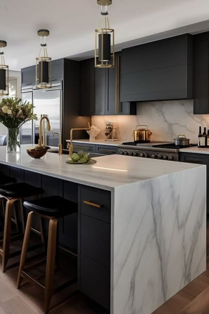 Black cabinets with soft white marble counters create a timeless look. The stone adds light and natural movement, preventing the black from feeling flat. This pairing works in both modern and classic homes because it feels familiar and balanced.
