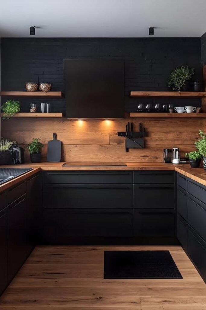 Black cabinets paired with pale wood and simple shapes feel calm and modern. This style focuses on balance rather than contrast. The result is a kitchen that feels easy to live in and easy to clean.