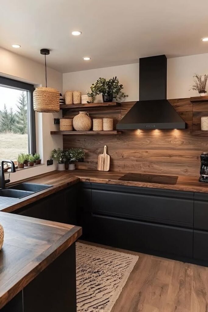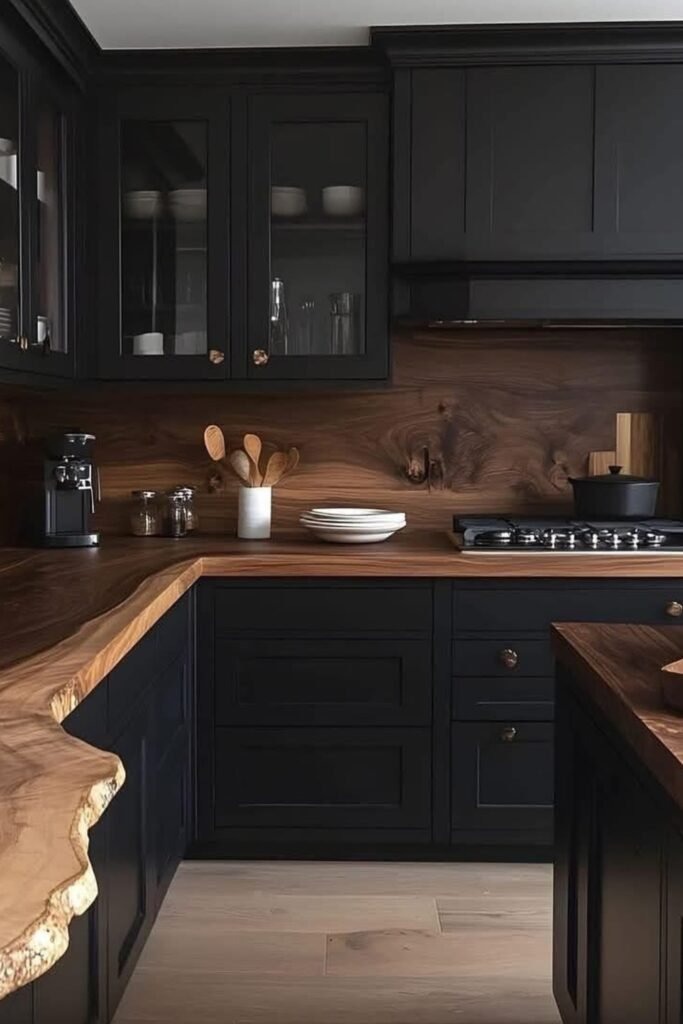 Live-edge wood counters or shelves against black cabinets create a natural focal point. The raw shape of the wood stands out clearly against the dark background. This style works best when the rest of the kitchen stays simple.