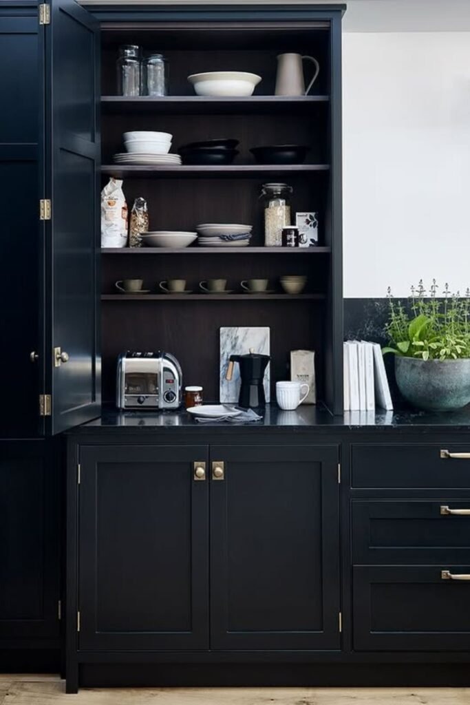 Black cabinets are perfect for hiding small appliances. A coffee nook tucked behind black doors keeps counters clean. When opened, it feels intentional rather than cluttered.