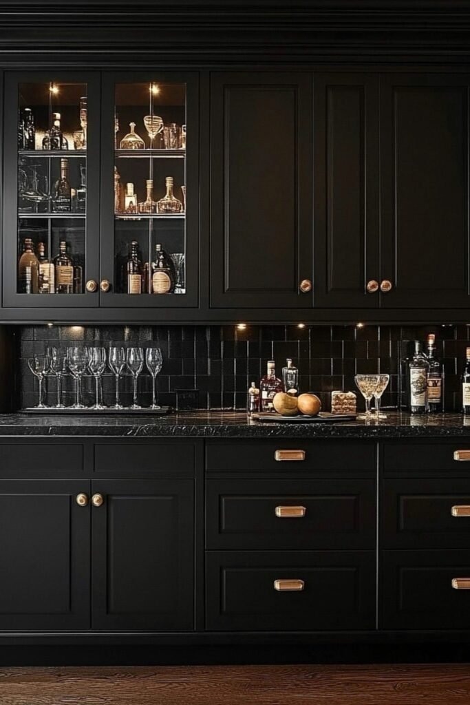 Black cabinets used in a kitchen bar area feel polished and grown-up. Paired with glass shelves or subtle lighting, they turn a simple space into a social hub without extra decoration.