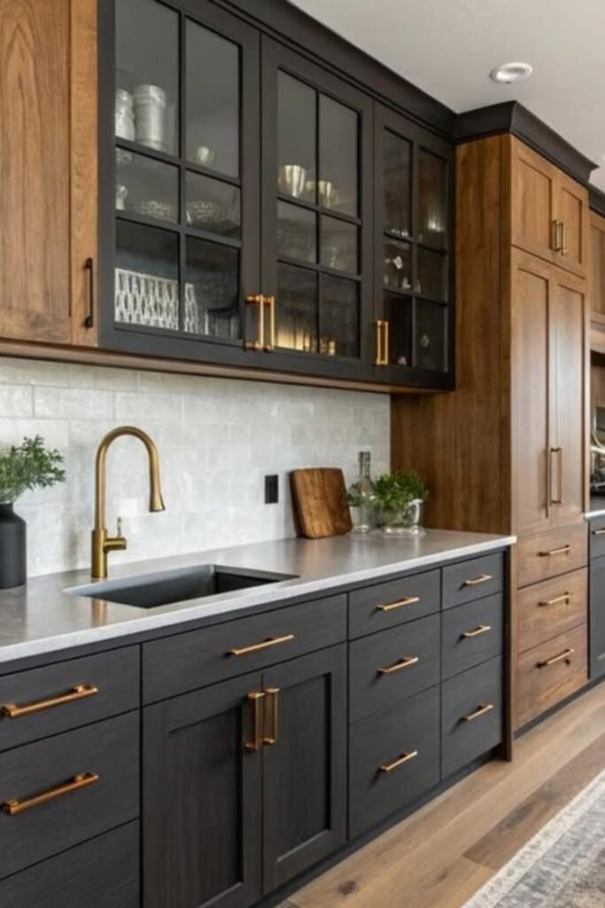 Black cabinets with brushed gold hardware add warmth without looking flashy. The metal catches light and gives definition to cabinet lines. This approach works well in homes that want a hint of luxury without excess.