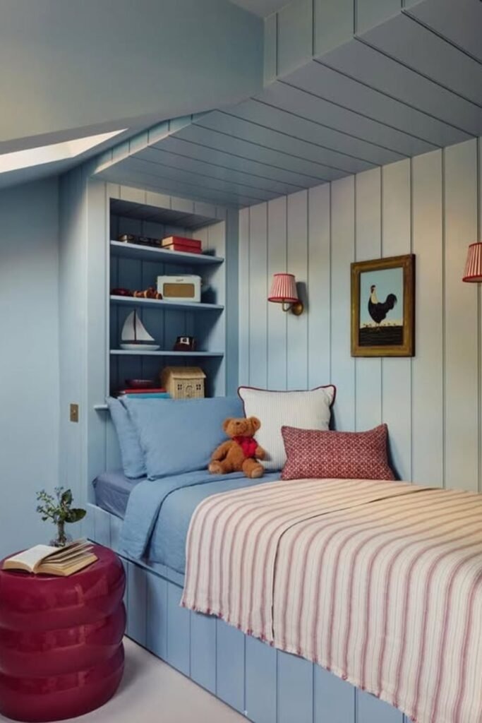 A blue alcove can turn a simple bedroom into a space that feels held and safe. Painting a sleeping nook or bed wall in a deeper blue creates a soft boundary around the bed. This can make falling asleep easier, especially in rooms with high ceilings or lots of open space.
