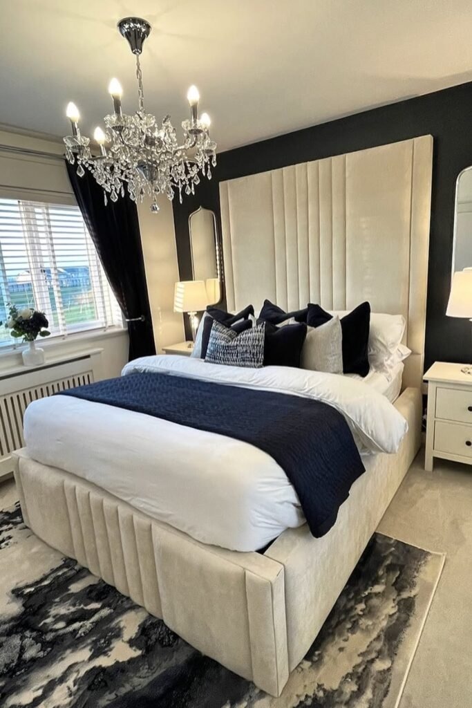 To keep it from feeling heavy, balance it with warm elements. Brass lamps, light wood, or cream fabrics help soften the look. This creates a bedroom that feels rich but still calm.