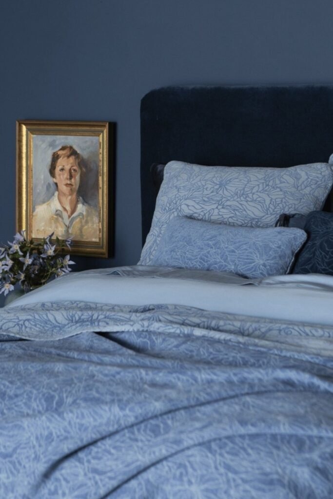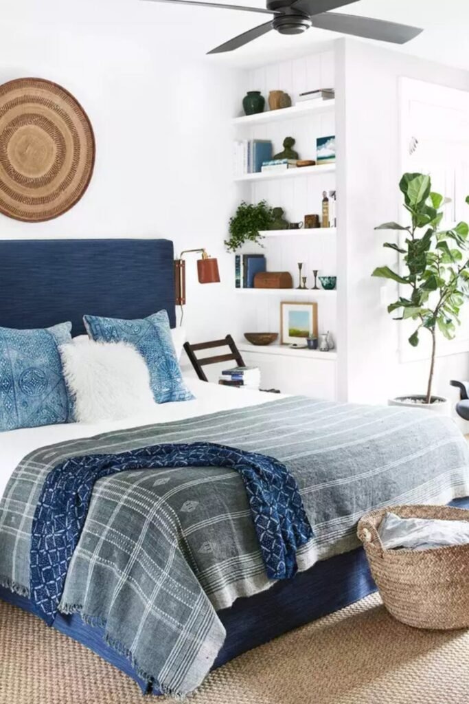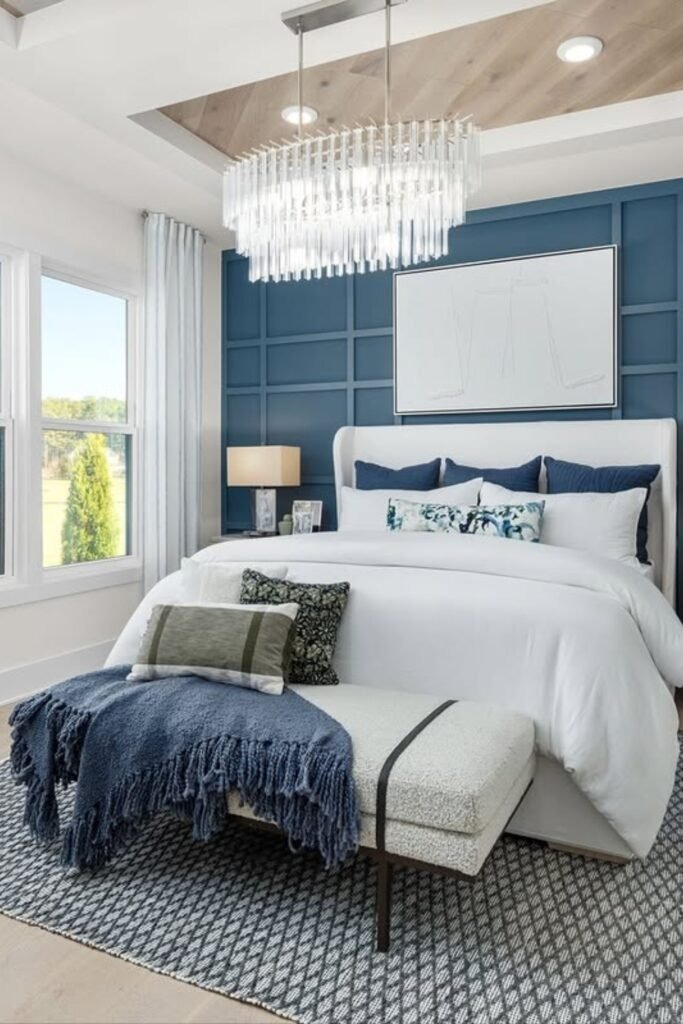 Lighting matters here. Soft, warm light keeps the blue from feeling cold. This type of room is ideal for people who struggle to shut off their thoughts at night.