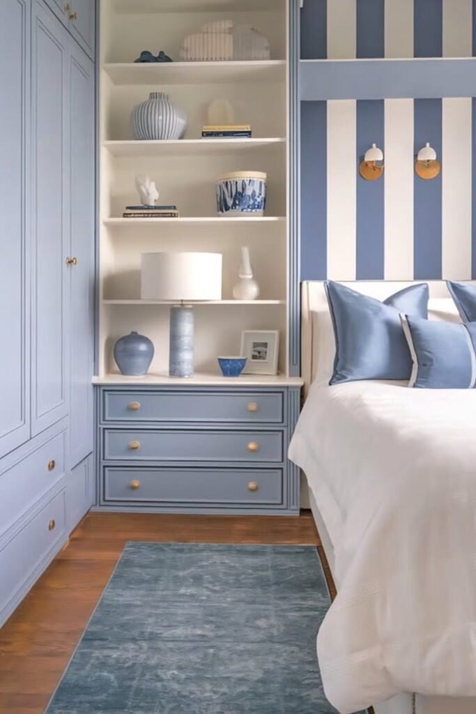 Soft blue built-ins bring calm structure to a bedroom without making it feel heavy. When shelves or cabinets are painted in a pale blue, they blend into the room instead of standing out too much. This works well in bedrooms that need storage but still want a peaceful feel. The color adds interest while staying quiet.