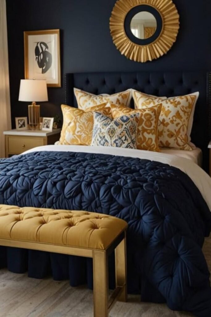 Navy and gold create a calm but refined bedroom. The navy grounds the space, while gold adds warmth.