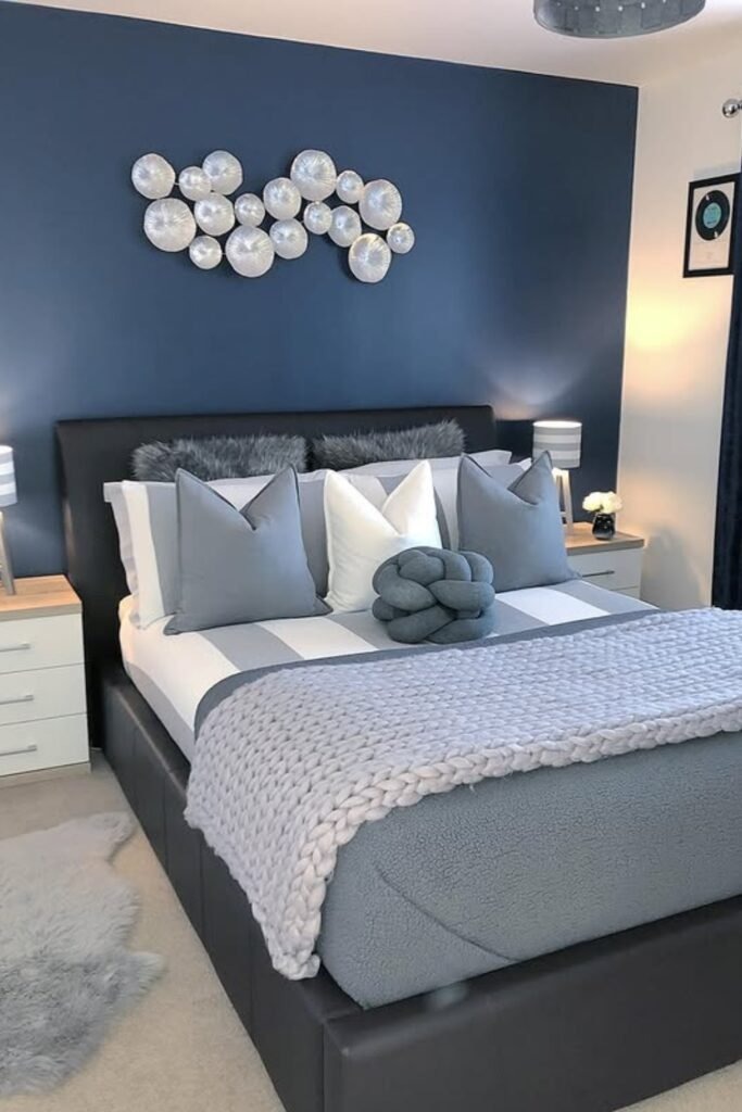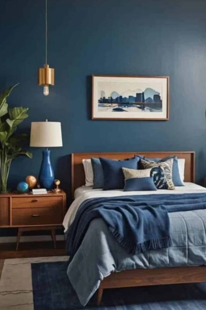 Navy blue brings depth and quiet strength to a bedroom. When used with lighter walls or bedding, it adds contrast without chaos. Navy works well on a feature wall, headboard, or lower half of the room.