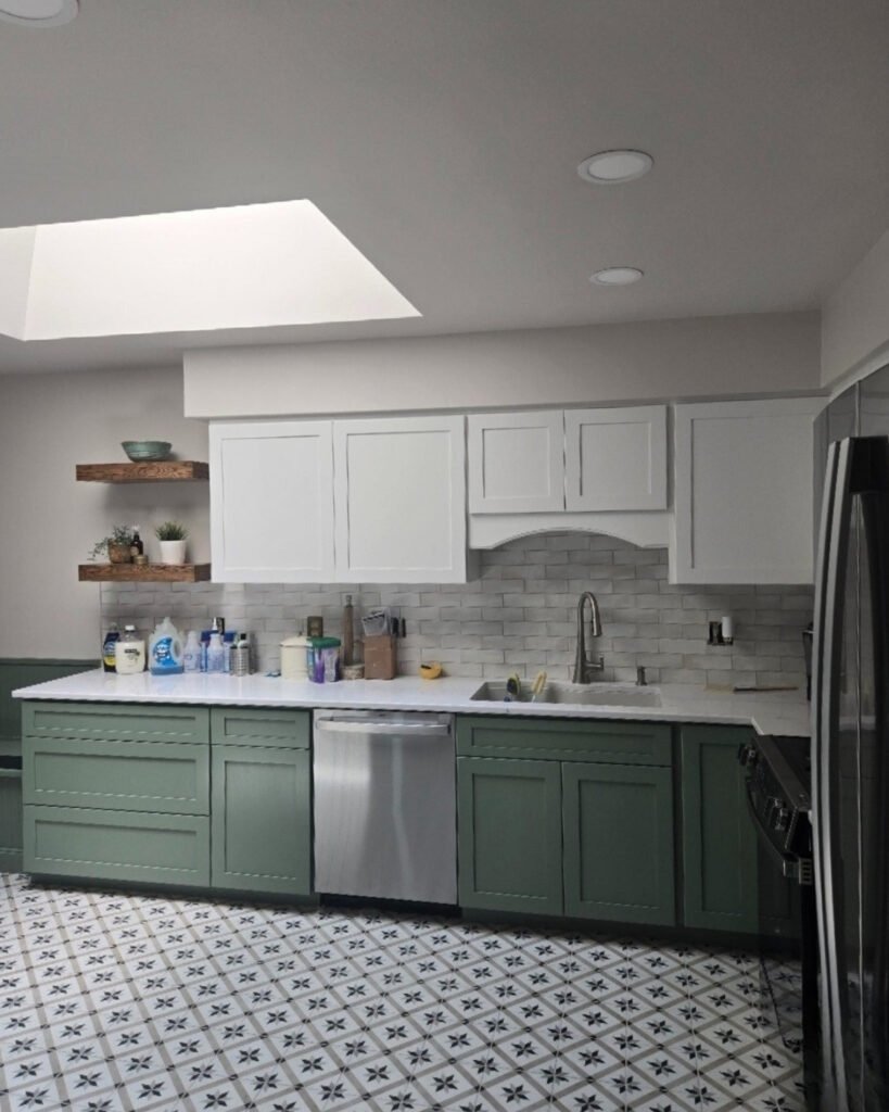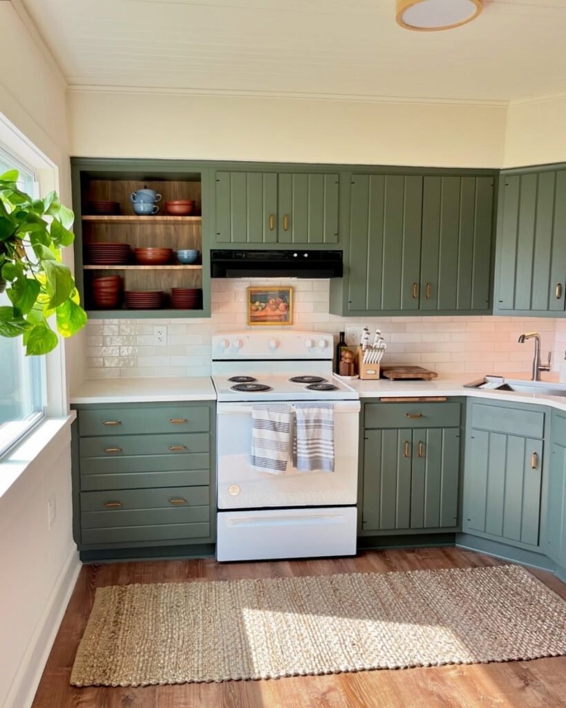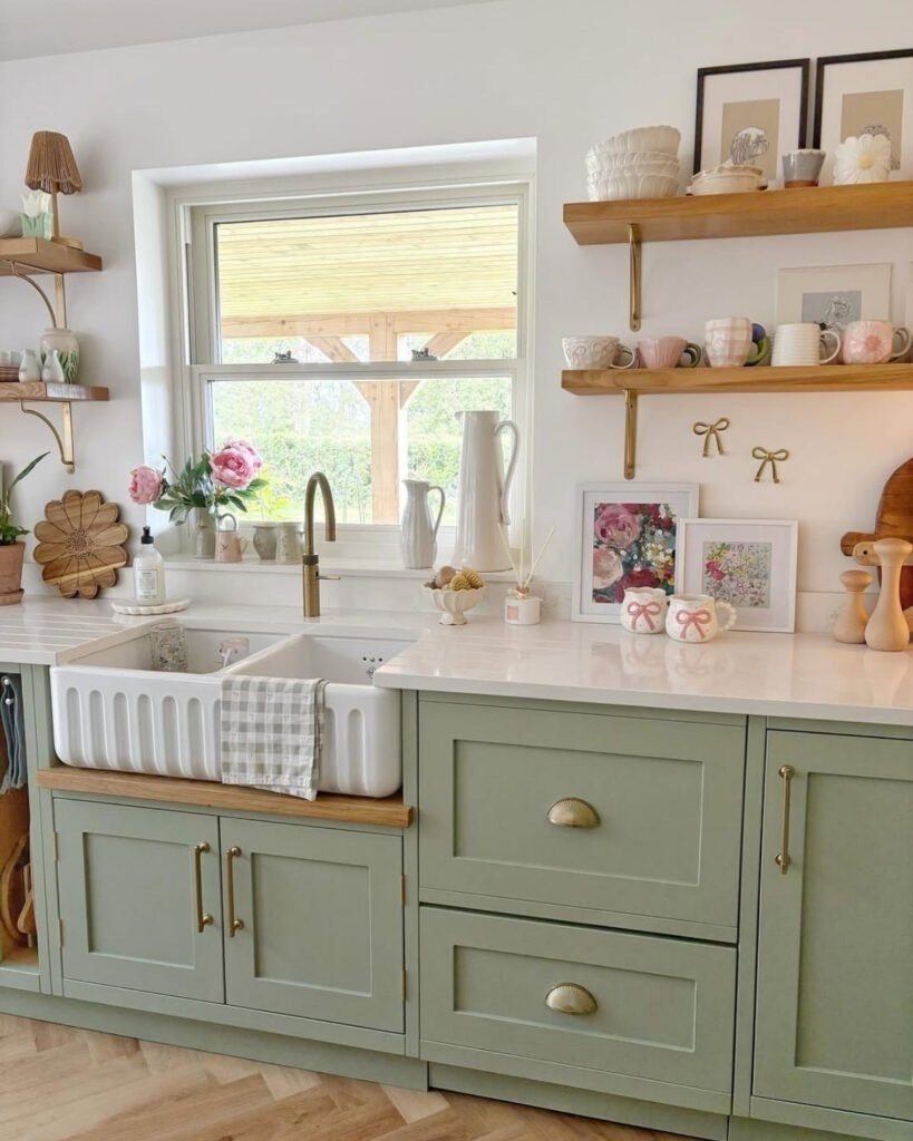 White countertops help clary sage feel lighter, especially in kitchens with limited natural light. The white reflects light back onto the cabinets, preventing the color from feeling heavy. This pairing is practical and timeless. It works in modern homes and older houses alike, making it a safe choice for 2026 kitchens.
