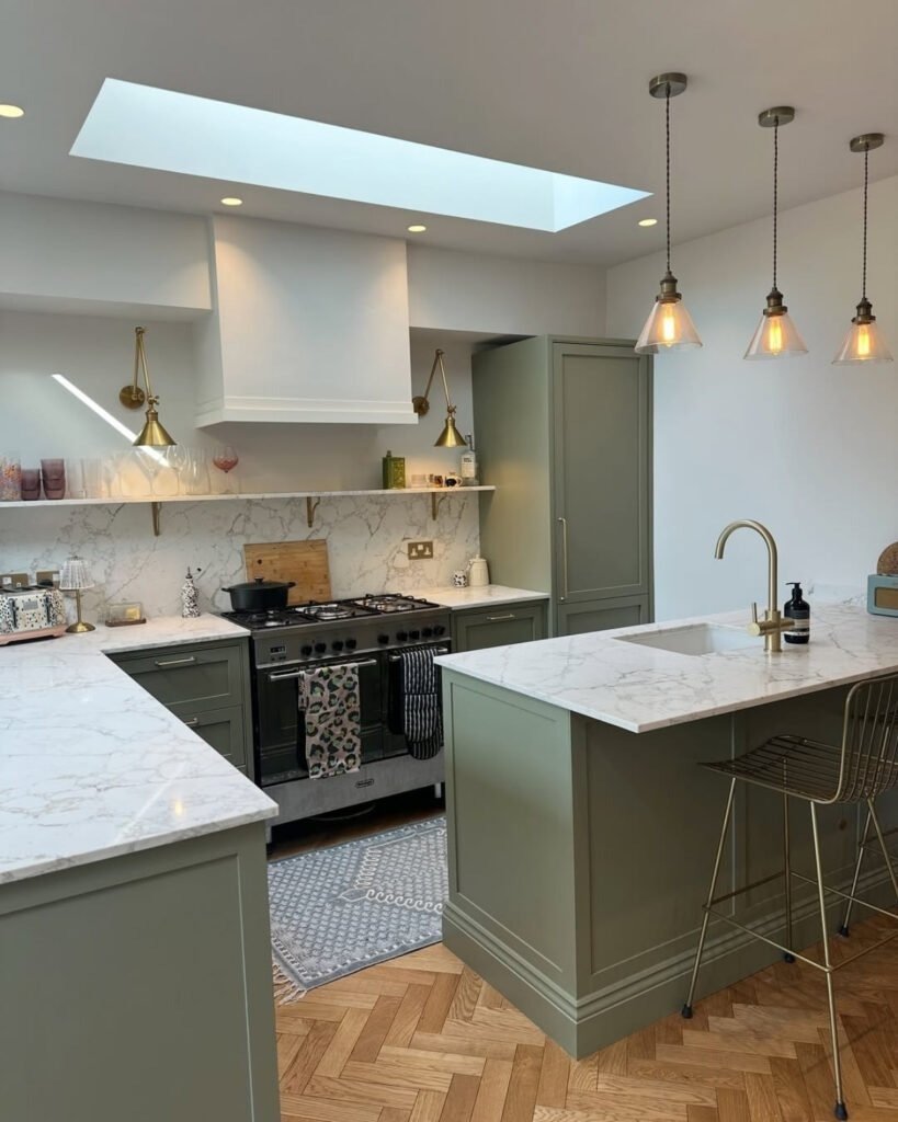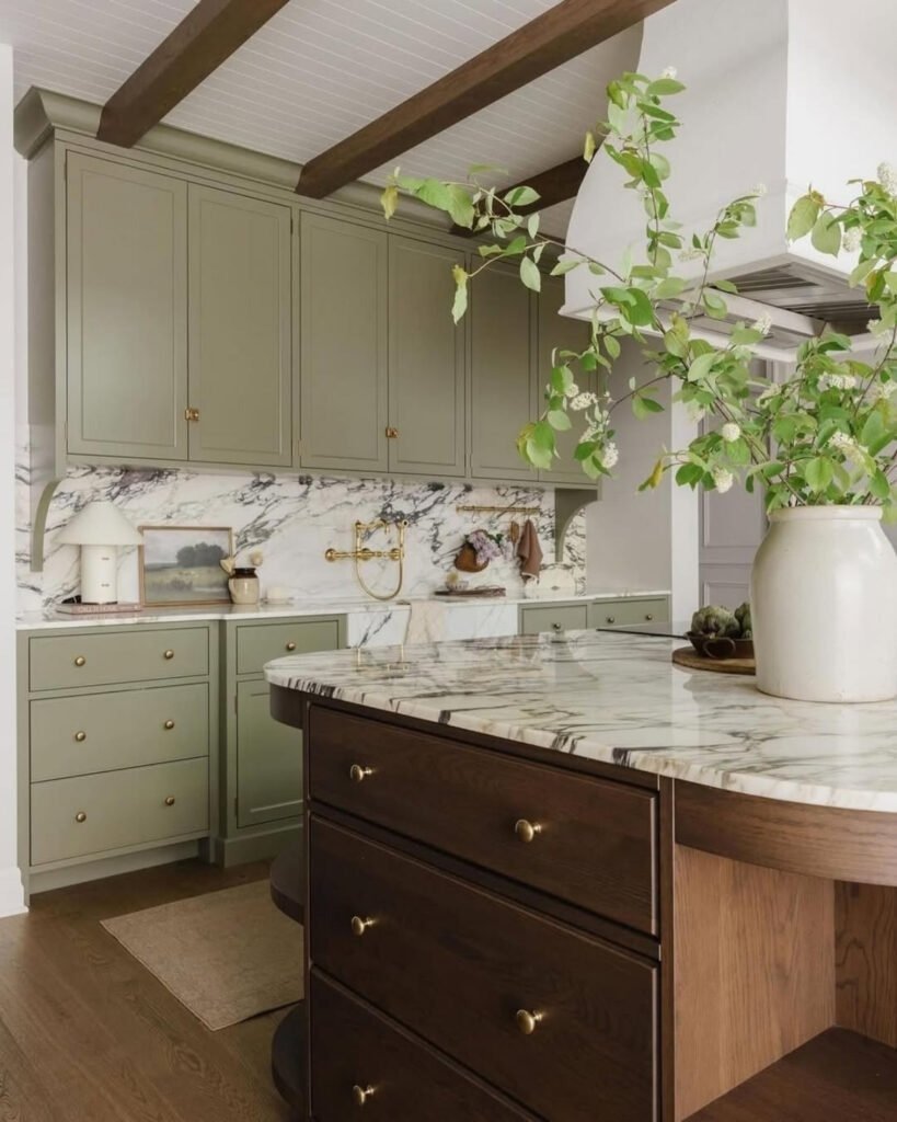 White marble and clary sage cabinets create a clean but soft contrast. The stone keeps the kitchen bright while the cabinets add warmth. This pairing works best when the marble has subtle veining rather than bold patterns. Too much movement in the stone can overpower the quiet nature of clary sage. When done right, the kitchen feels fresh without feeling cold.