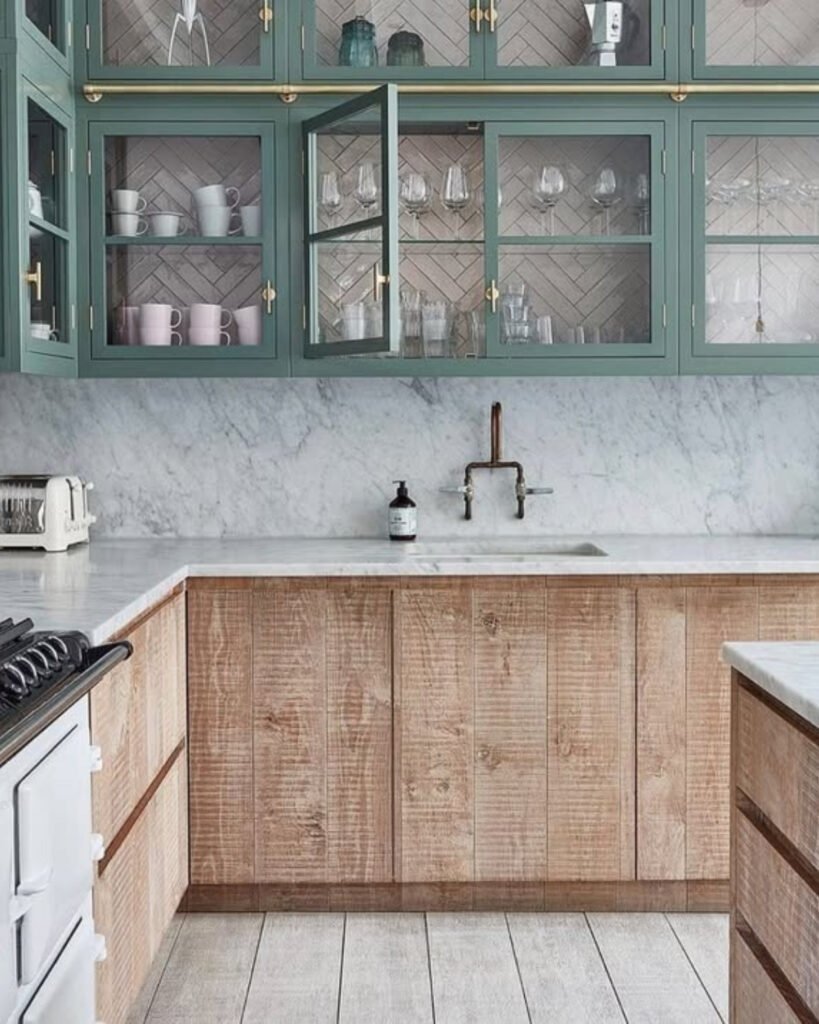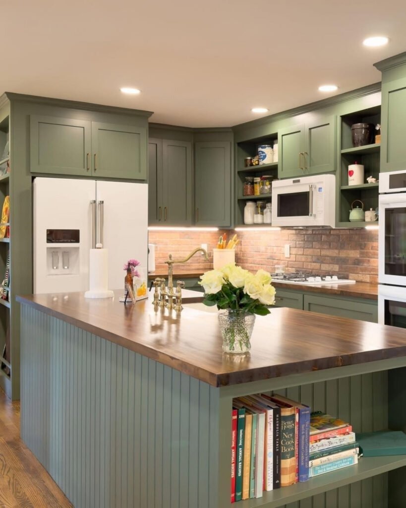 Clary sage cabinets paired with natural wood feel calm and honest. This combination works because both elements come from nature and speak the same visual language. Light wood shelves, wood islands, or wood trim warm up the green and keep it from feeling flat. In family kitchens, this pairing feels relaxed and welcoming rather than styled. The wood brings life, while clary sage keeps everything grounded.