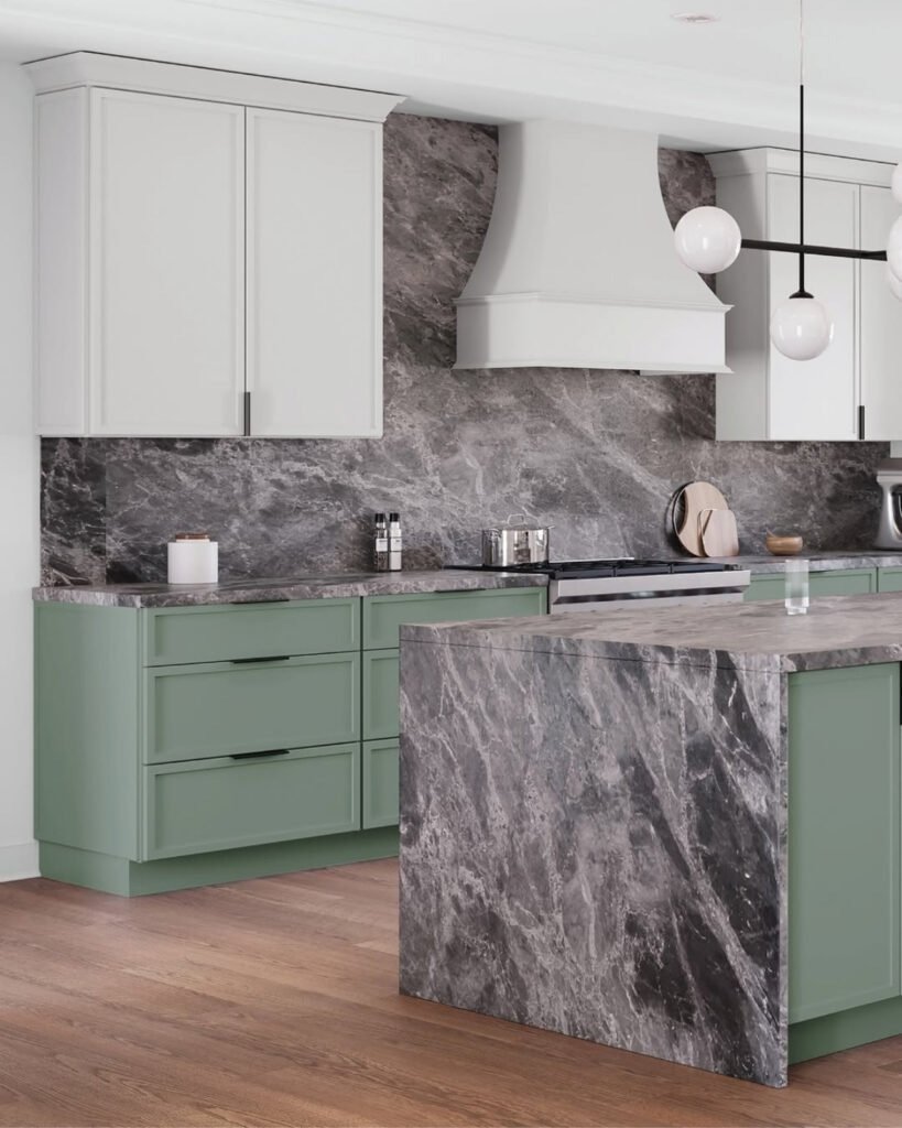 Bold stone can work with clary sage if handled carefully. The key is letting one element lead. When the stone has strong movement, clary sage acts as a calm background rather than a competitor. This pairing works best in kitchens where the stone is the focal point and the cabinets support it quietly.