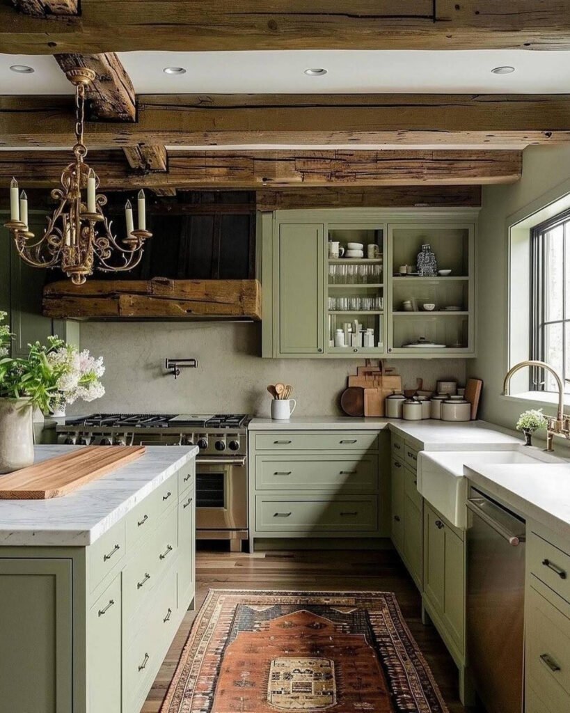 In larger kitchens, clary sage can be balanced with darker wood tones. Think deep-stained islands or wood beams. The darker wood anchors the space and gives clary sage something to lean against visually. This pairing feels stable and mature, which is why it works well in homes meant for long-term living rather than quick resale.