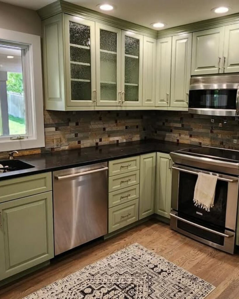 Clary sage is one of the safest green tones you can use on kitchen cabinets, even though it looks bold at first glance. It sits between green and gray, which means it calms down the space instead of taking over. In real kitchens, this color hides wear better than white but does not feel heavy like dark green can. That balance is why designers keep returning to it.