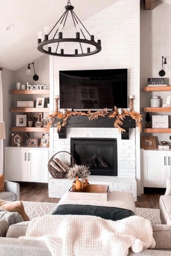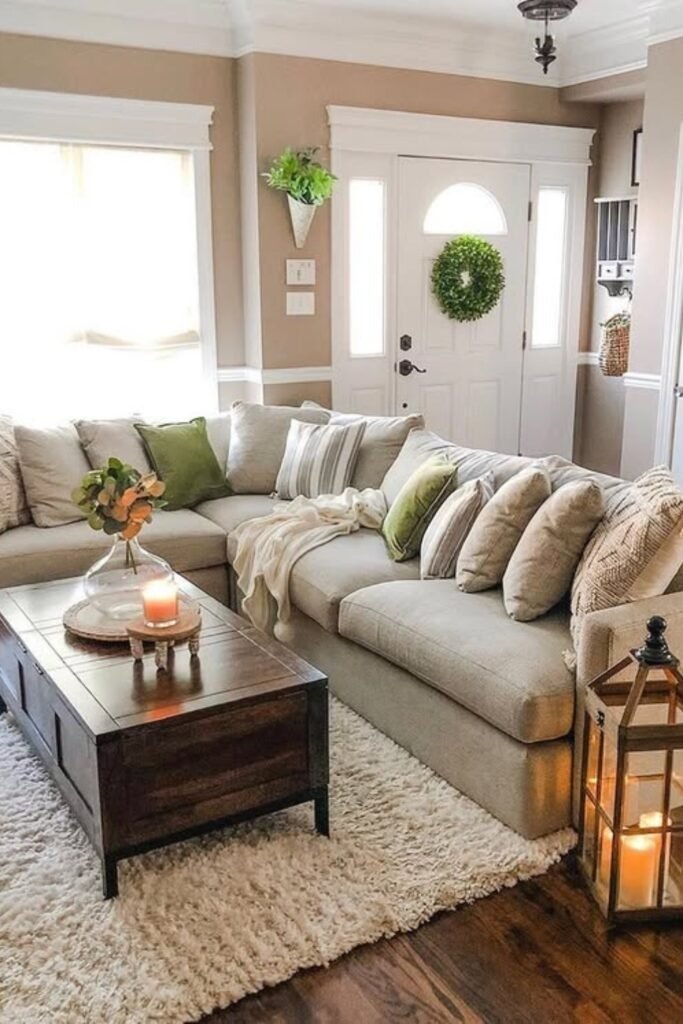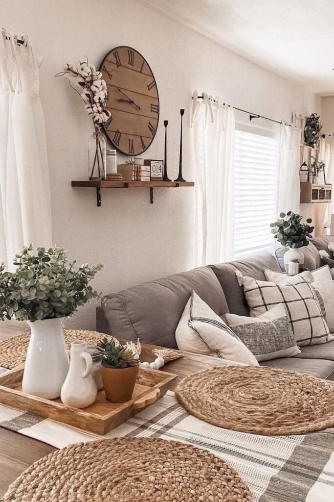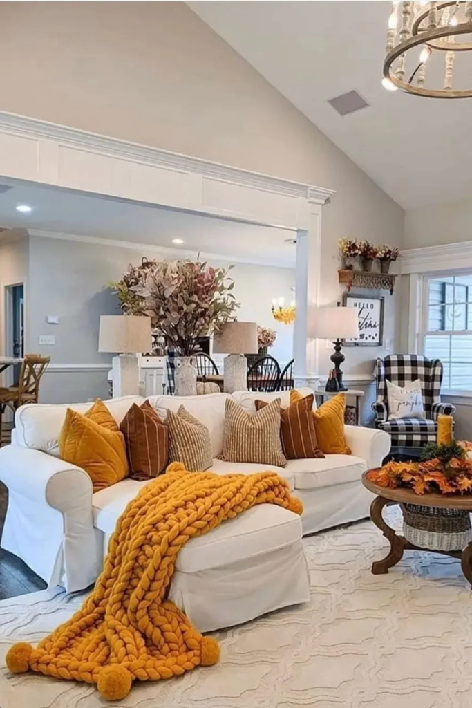 Seasonal touches bring warmth to farmhouse spaces. In autumn, add soft orange, brown, and mustard tones through pillows, throws, and small décor accents. Wooden furniture and natural fibers complement the colors. This approach keeps the room feeling dynamic and connected to nature, highlighting the seasonal adaptability of farmhouse style.