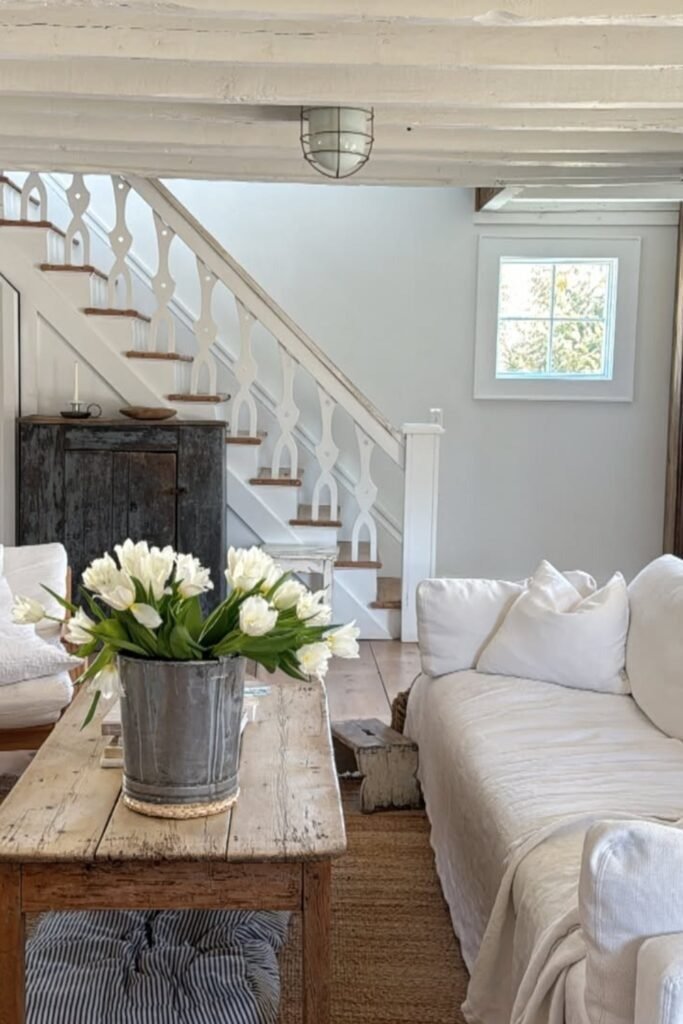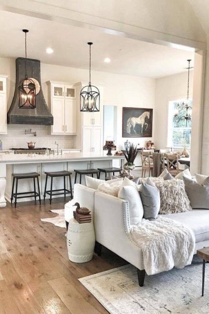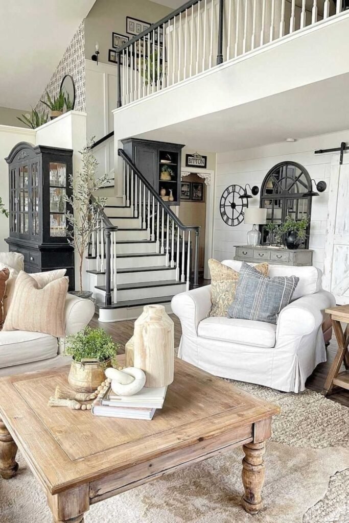 Airy neutral living rooms maximize light and space. White or soft beige walls, light wood floors, and minimal furniture keep rooms open. Layering textures such as wool, linen, and cotton ensures the space remains cozy. This style prioritizes comfort and simplicity, allowing farmhouse elements to shine without visual clutter.