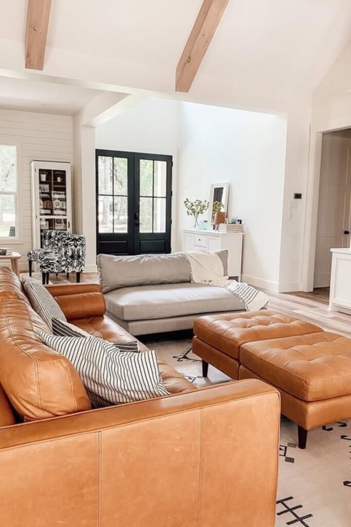 Incorporating leather adds a grounded element to farmhouse living rooms. Deep brown or cognac leather sofas contrast against lighter walls and floors, giving depth without heaviness. Pair leather with wooden furniture and neutral textiles to maintain warmth. Leather chairs or ottomans create a lived-in feeling and offer durability for high-traffic areas. Subtle metallic accents, such as bronze lamps or hardware, enhance the rustic feel while keeping the room polished.