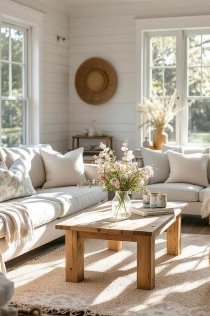 Natural light is central to farmhouse living rooms. Large windows, minimal window treatments, and light wall colors maximize sunlight. Add cozy seating with plush cushions, and incorporate wood tones to ground the space. Sunlit rooms feel warm and inviting, highlighting textures like woven rugs and wooden coffee tables. The overall effect is simple, comfortable, and deeply welcoming.