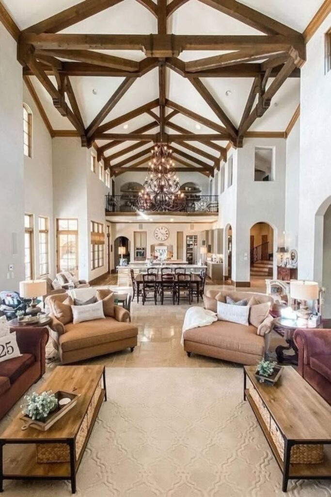 For larger living rooms, lodge-inspired farmhouse designs are ideal. Use heavy wooden beams, stone accents, and rich textiles to create a cozy, layered effect. Large sectional sofas or leather seating anchor the space, while rugs and throws soften the look. Lighting is key: warm-toned lamps and overhead fixtures highlight textures and create atmosphere. This approach embraces farmhouse scale and makes the room feel both luxurious and grounded.