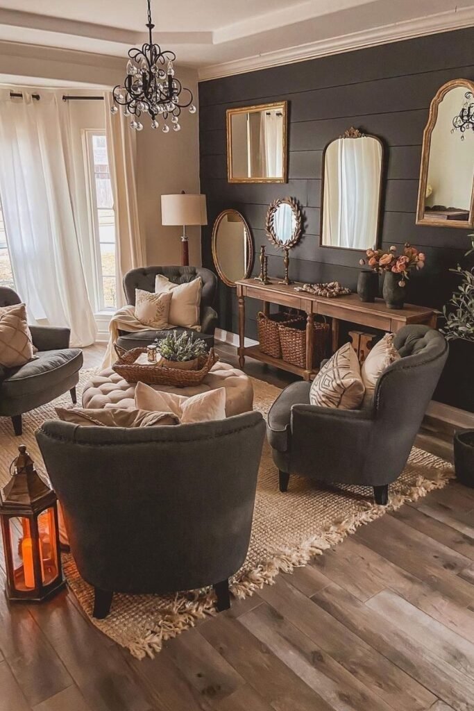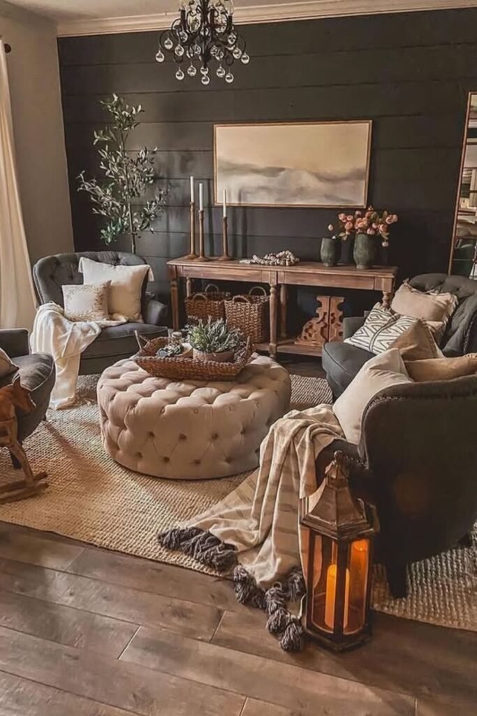 Moody tones are becoming popular in farmhouse living rooms. Deep grays, muted greens, or rich browns add depth without sacrificing warmth. Balance the darkness with natural wood, soft fabrics, and ample lighting. Layering textiles and metallic accents ensures the room feels inviting rather than heavy. Moody farmhouse rooms create intimacy and character, perfect for evenings or cozy gatherings.